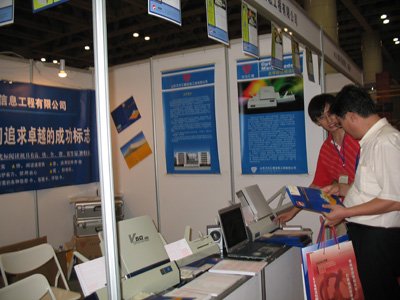 9月15日至17日,我公司应邀参加了在烟台举行的“2007年山东省教育博览会暨第四届教育用品展示会”,会议期间展示了公司最新推出的两款新型光标阅读机以及新研制开发的评卷系统、教学评估软件、学籍管理软件及配套信息卡,受到众多参观者的广泛关注。其中,本次会议期间展示的带液晶显示面板的新型光标阅读机,具有外观新颖,阅读速度国内最快和免维护等特点。 图一:我公司展位